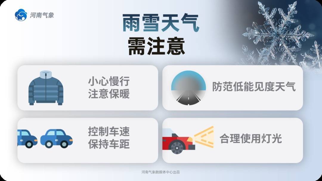 随着冷暖空气进一步交汇,此次雨雪将自西向东逐渐扩展至全省。预计今天下午到夜里中西部、西南部将有中到大雪,局部暴雪;黄河以北和开封、商丘有小到中雪,山区有大雪;东南部小雨或雨夹雪转中到大雪,局部暴雪,同时全省有东北风4级左右,阵风7级左右。明天全省大部放晴,东南部零星小雪逐渐停止。提醒大家提前做好出行计划,驾车注意保持车距,谨慎慢行。
